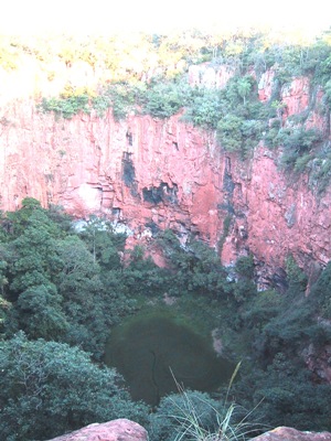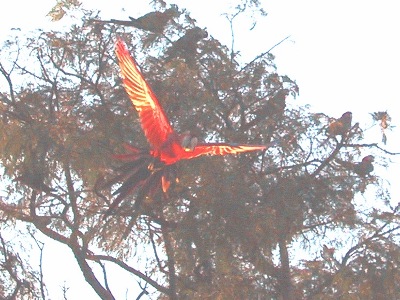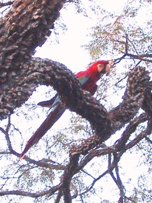 | The cliffs of this deep, circular hollow provide a home to a large colony of scarlet Macaws who nest here out of the reach of big cats and snakes, their main predators. |