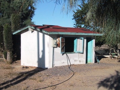 | In Central Baja we had a very strong headwind for several days. One day the wind was so strong we decided to take shelter in a small oasis in the desert - a water pumping station. Outside the fence everything was completely barren. Inside there were trees including a lemon tree and a fruit and vegetable patch with strawberries. |