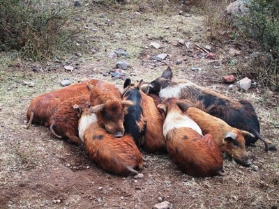 | A pile of pigs. |