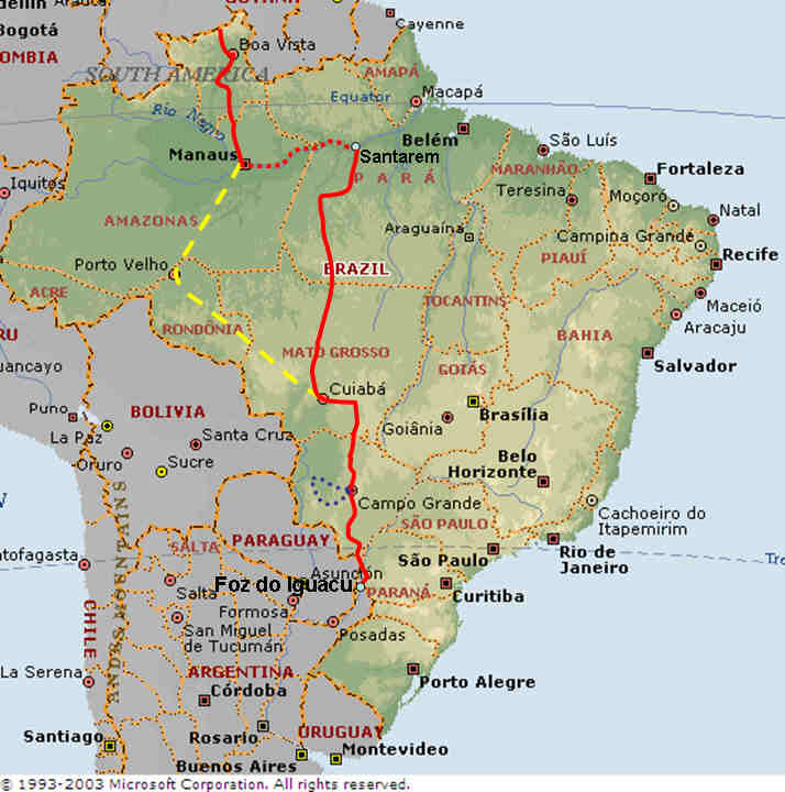 From Manaus we took a tour along the Rio Negro out to a floating lodge where we stayed for one night. After searching bicycle shops and trying to retrieve poste restante mail unsuccessfully, we boarded a boat to Santarem. From Santarem we headed south along an unpaved road which we think must be the toughest section of the journey so far with very poor surface, lots of rain and plenty of hills. We have included more details about this section of road and the difficulties we encountered as a separate note. From the state of Para we continued South to the plains of Mato Grosso before reaching the Pantanal at Cuiaba where we were slightly more successful with post receiving half of what we were expecting. After visiting Chapada dos Guimaraes National Park we climbed east into the Sierra do Sao Vicente before heading in a more southerly direction to Campo Grande. From Campo Grande we made a side trip (blue dotted line on map) visiting Bonito and the Pantanal before getting back on our bikes and heading on to Foz do Iguacu and from there into Argentina.