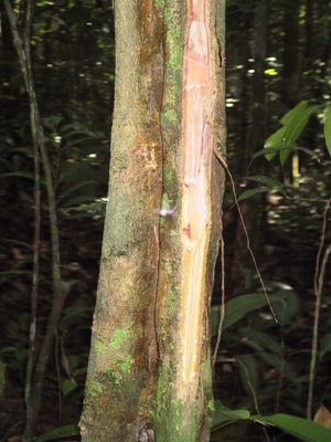 | After this we went on a guided jungle walk. We were shown how to tell which vines contained drinking water by scraping the bark to reveal a red colour. There is a surprising amount of water in these vines. We will have to remember this for when we next run out of water when cycling. Still I don’t think our penknives would do a good job on these. |