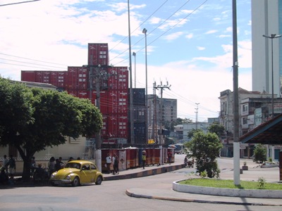 | The importance of the Amazon River for transportation is apparent from the City's streets with piles of containers dwarfing neighbouring buildings. |