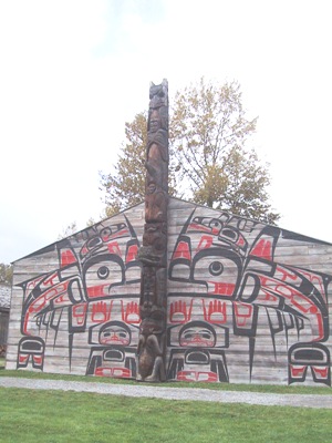 | We visited some traditional longhouses. The exterior is painted with striking motifs of animals and gods. |