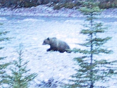 | It was on this stretch that we saw a grizzly bear. These are larger than the black bears with males measuring a scary two meters from nose to tail. We thought we were safe on the other side of the river but he crossed it within a few seconds so we had to make a swift exit shielded by a car. |