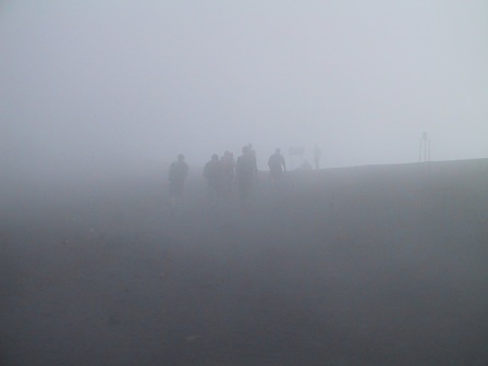 | The lower slopes are in the clouds. Our guide explained that if we get lost our group would be known as 'the boat' and we should ask for that ... but ask who? |