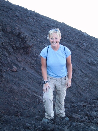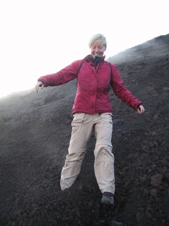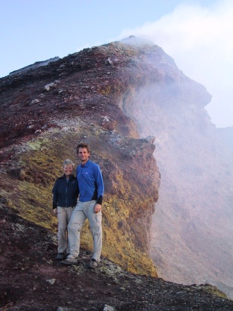 | The smoking crater. Every few minutes a cloud of choking sulphur dioxide came our way. No flames but this is active enough for us at this close range. |