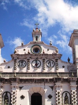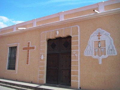 The church of Los Dolores in Tegus. There is a mixture of Catholic and indigenous symbols displayed on the façade including Passion of Christ and the Sun.