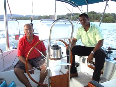 | Our Captain, John (left) and our ‘Advisor’, Victor (right). Within the Canal, Captains have to hand over control of their boats to the Advisors and Pilots who work for the Canal Authority. |