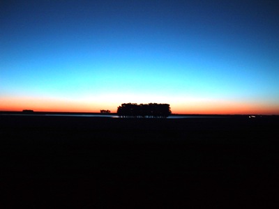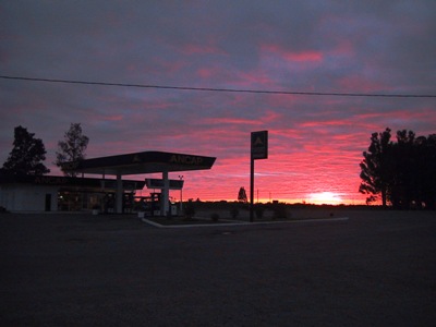 | Our camp outside of this petrol station was the last time on the trip that we slept in our tent. This was the view as we set off at dawn. |